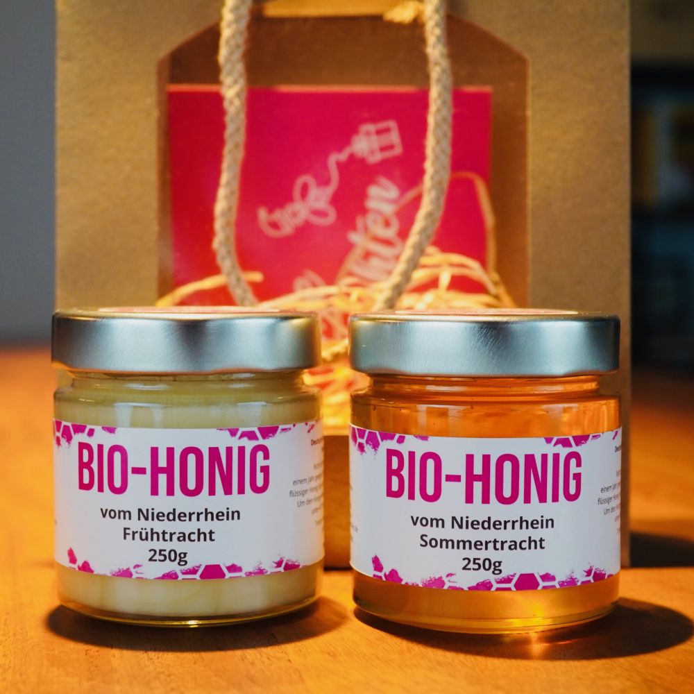 Unsere Produkte sind rund um die Uhr im Honigschrank in Bedburg-Hau (Uedemer Straße 204) erhältlich – ein Selbstbedienungsschrank, der regelmäßig mit frischem Bio-Honig und saisonalen Imkereiprodukten befüllt wird.