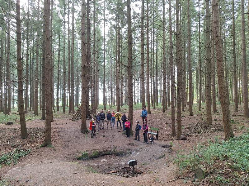 Eine Gruppe Menschen steht im Wald auf einer Lichtung.
